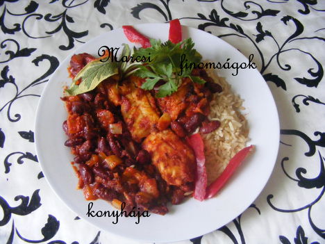 A hagymát apró kockákra vágom és az olajon üvegesre párolom,majd ráteszem az áttört fokhagymát a csíkokra vágott halszeleteket,sózom borsozom.A halat jól átsütöm.ráöntöm a sűrített paradicsomot a kis kockákra vágott tv paprikát a lecsepegtetett megmosott vörös babot fűszerezem és lefedve kb 10 percig forralom .Barna rizzsel tálalom